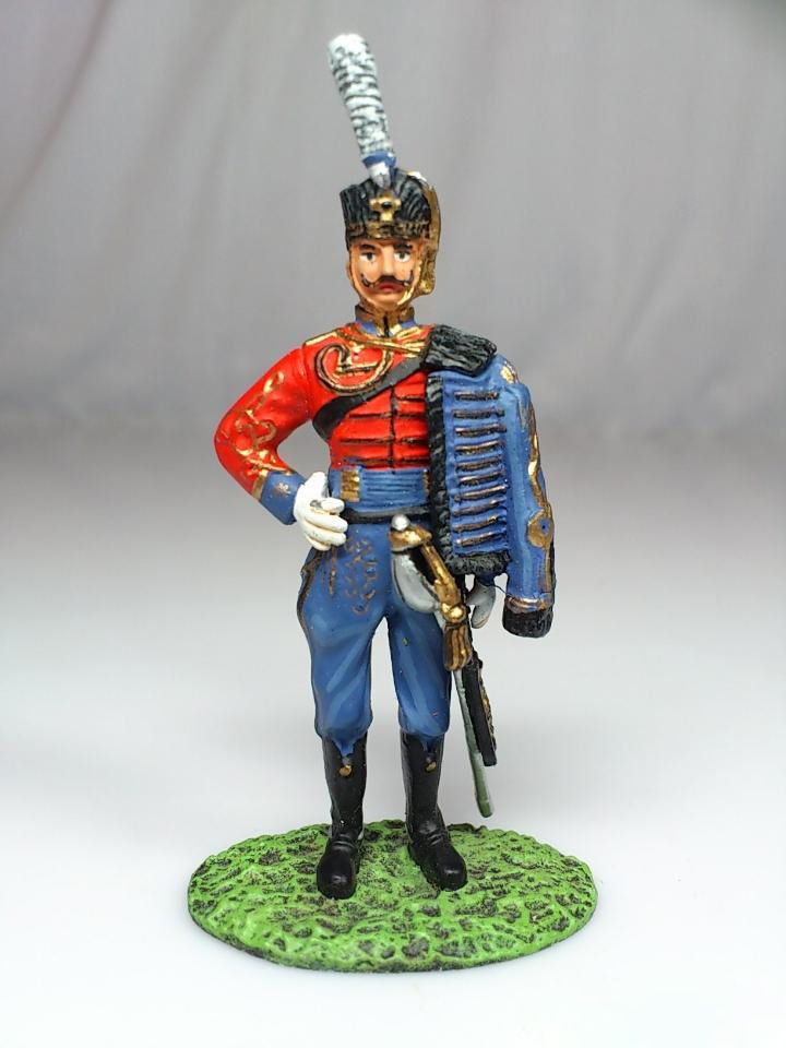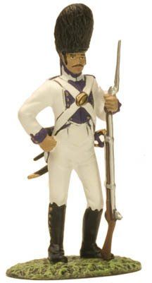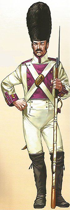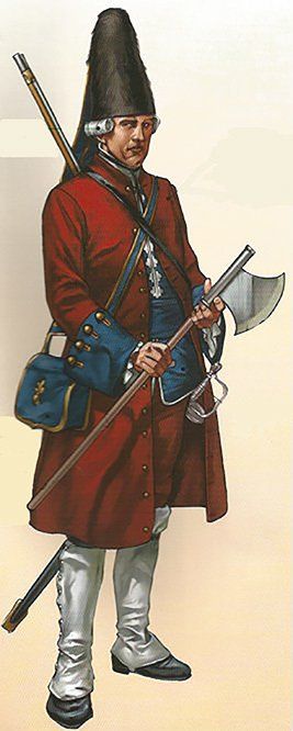 Los granaderos vestían idéntico uniforme, salvo en el característico gorro de pelo negro, que iba provisto de una manga en color azul con vivos dorados. Las bocamangas llevaban varios botones y ojales con hilo de oro.