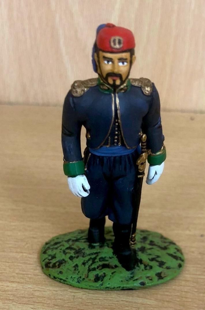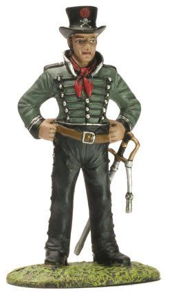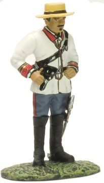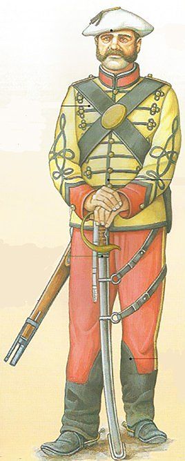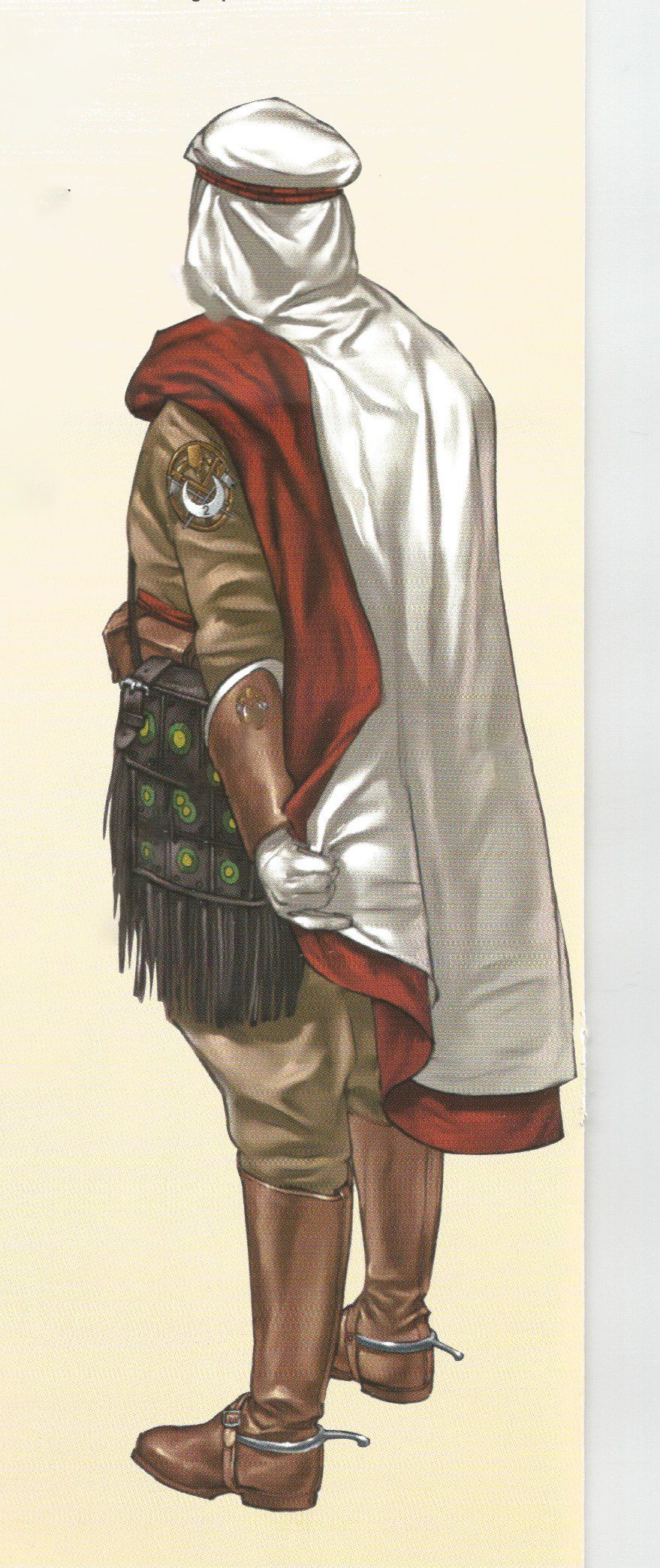 Calza botas con espuelas. La cintura se la ciñe con la faja de color rojo propia del grupo; el correaje está muy trabajado por un guarnicionero. En el costado derecho se aprecia una skara de piel.