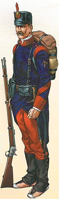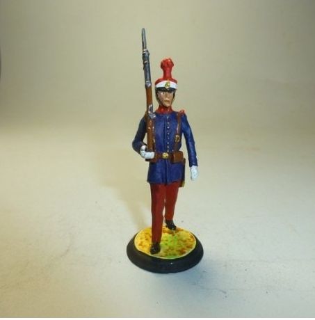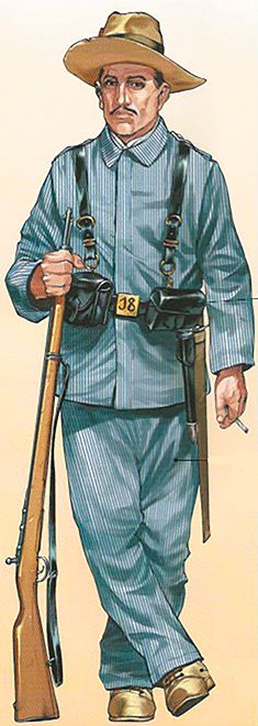 El uniforme del soldado de la ilustración es una combinación no totalmente reglamentaria de otros dos uniformes y de una variante para Marruecos: la guerrera de paño azul turquí que se reglamentó en 1909 para la tropa de la mayor parte de las armas y cuerpos, los cuales se distinguían por el color de los cuellos y los emblemas que iban sobre ellos. Los pantalones y las polainas son de rayadillo y corresponden al uniforme de verano de 1901. En ingenieros, el cuello de la guerrera era grana y el emblema consistía en un castillo de plata.