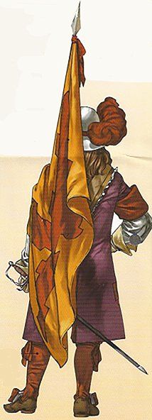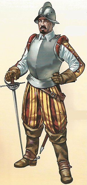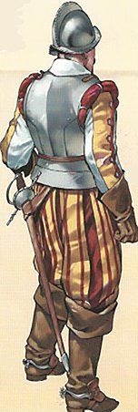 Hasta finales del siglo XVII no puede hablarse de la existencia de uniformes militares en sentido estricto, pero si se hacia uso de unas prendas características del soldado. Cada nación solía utilizar unos colores característicos en banderas, plumas, fajas y otros adornos. Las tropas españolas en el campo de batalla se distinguían por utilizar el color rojo. El vestuario del soldado de la época se componía generalmente de una camisa, un jubón, es decir, una sobrecamas de paño fuerte, y unos calzones anchos, llamados gregüescos, que se anudaban es su parte inferior. Ademas se empleaban medias de estambre encarnado y zapatos de cordobán o piel de vaca sin teñir.