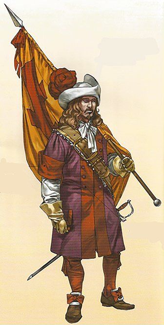 Para protegerse de los sablazos enemigos, se llevaba encima un coleto de ante, es decir, una especie de chaleco grande sin mangas y con amplios faldones. Típico de este periodo era la utilización, tanto por los soldados como por los oficiales, de un sombrero de ala ancha llamado chambergo, puesto de moda por el mariscal Schomberg, que se adornaba con plumas encarnadas.