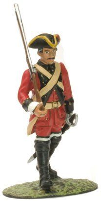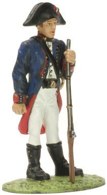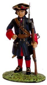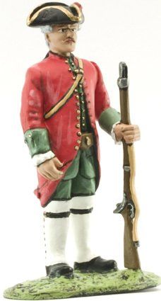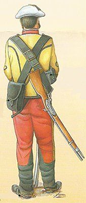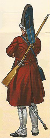 La otra prenda distintiva del militar del siglo XVIII era el cubrecabezas. Normalmente era un sombrero con forma de candil, llamado popularmente “de tres picos”. Estaba provisto de una escarapela o cucarda que se llevaba en el lado derecho y que era un lazo de color representativo de cada monarquía, encarnado en el caso de España, blanco en el de Francia, negro en el de Inglaterra, etc. Completando estas dos prendas principales, el soldado bestia ademas un chaleco (chupa), que podía estar provisto o no de mangas. También un calzón de media pierna, comida con corbatín y medias. Completaban el vestuario los zapatos de hebilla y las polainas lienzo abotonadas, que tenían como objeto proteger el calzado, las piernas y rodillas en campaña, aunque se utilizaban también para ocasiones de gala. El soldado de caballería recibir a veces botas de montar de caña alta, que protegían las rodillas, aunque era frecuente que usara también polainas, especialmente en las unidades de dragones. En esta época se utilizaban unas grandes espuelas de hierro, que se fijaban mediante una ancha correa de cuero y una cadenilla que pasaba por la parte inferior del calzado. Como accesorios para el combate se llevaban canchas correas de cuero cruzadas “en bandolera” sobre el cuerpo. Ademas de utilizarse para transportar tanto la cartuchera con munición de del fusil como el arma blanca, servían para proteger lo hombros de los sablazos del enemigo. Otras prendas que completaban la uniformidad era una capa de abrigo de color crudo, un gorro de cuartel y un par de guantes.