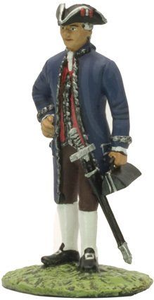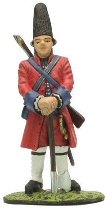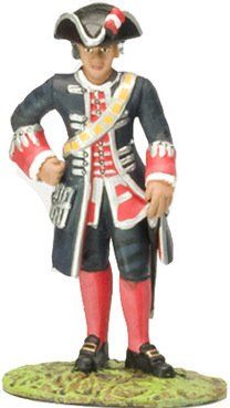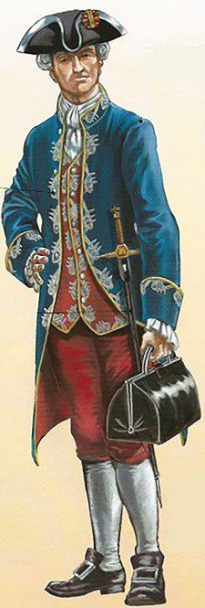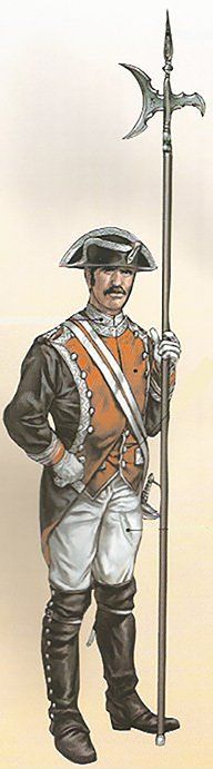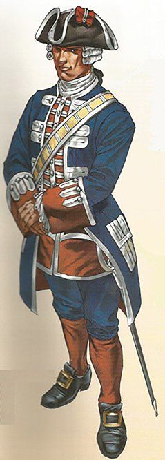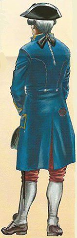 Posteriormente, en el reinado de Fernando VI, los faldones se hicieron mas pequeños y rígidos mediante la utilización del “tontillo” o armazón interior que los mantenía abierto y extendido. La casaca estaba galoneada en plata, tanto en sus bordes como en los bolsillos y los ojales. Las bocamangas llevaban grandes ojales ribeteados de galán de plata. Todos los botones eran también de metal blanco o plateado. El calzón era azul. El chaleco o chupa era de color grana, galoneado también de plata.
