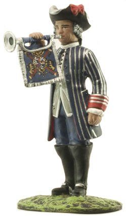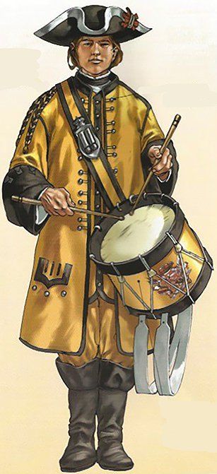 Para que se les reconociera y distinguiera mejor a distancia, los tambores en infantería, los trompetas en caballería y los tambores, oboes y timbales en dragones, vestían casacas con las vueltas y, ademas, montaban sobre caballos tordos.