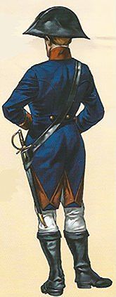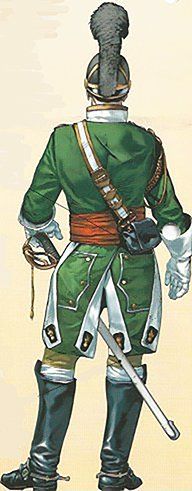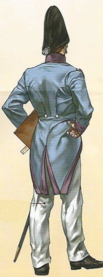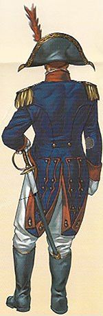 El uniforme que representamos en el Archivo General de Simancas, donde puede verse el dibujo del delantero izquierdo y de su espalda, en los que destacan los peculiares galoneados de frente, vuelta de las mangas, carteras y contracarteras. La casaca y el calzón son de paño azul, mientras que la chupa y las vueltas de la casaca dice que son de grana; en la Real Orden mencionada como “encarnadas”, coloradas, rojas, mientras que aquí, al concretarla en “grana”, se refiere al modelo del tinte, que sobre la base de las agallas que forman las hembras de la cochinilla que vive en las coscojas, arboles parecidos a las encinas, y que dan esta peculiar tonalidad.