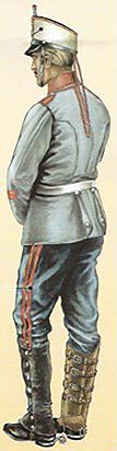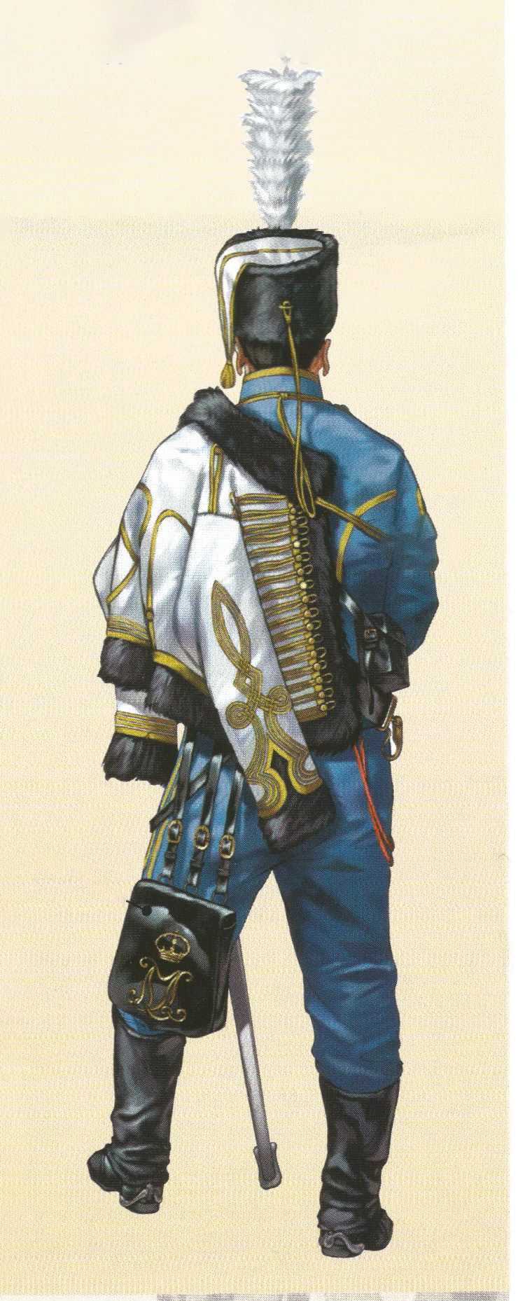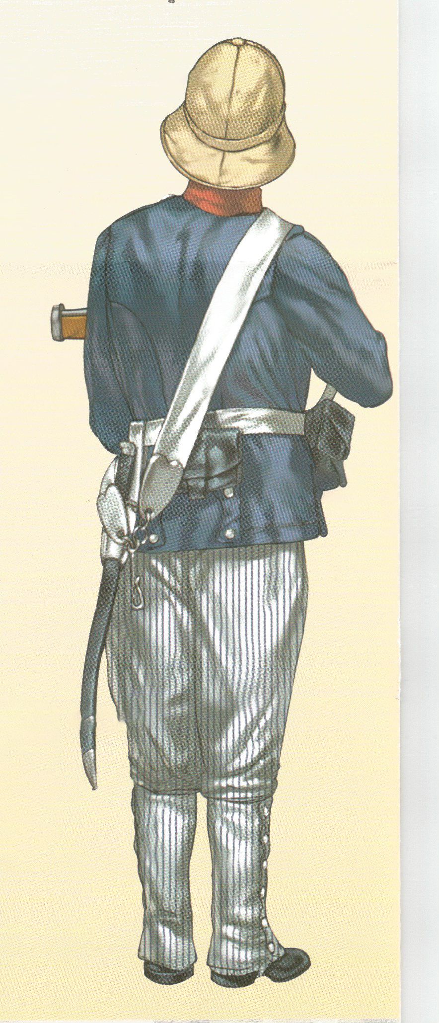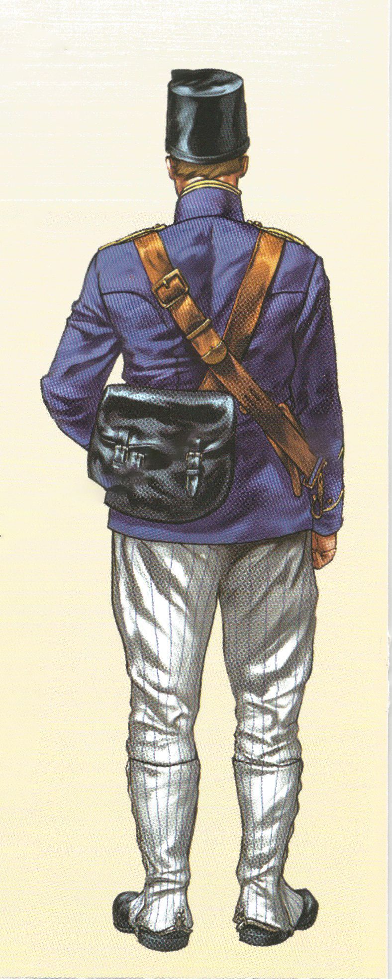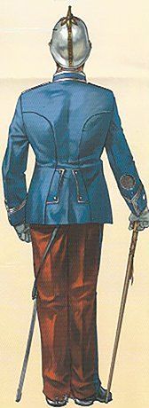 El pantalón que se utilizaba era ceñido y de punto blanco. Las polainas de gala estaban hechas con paño azul turquí y llevaban una docena de botones pequeños del cuerpo en el costado exterior y cuatro más de hueso negro en las trabillas. Completaba el uniforme el correaje amarillo, los borceguíes negros lisos con pala de una pieza y los guantes blancos.