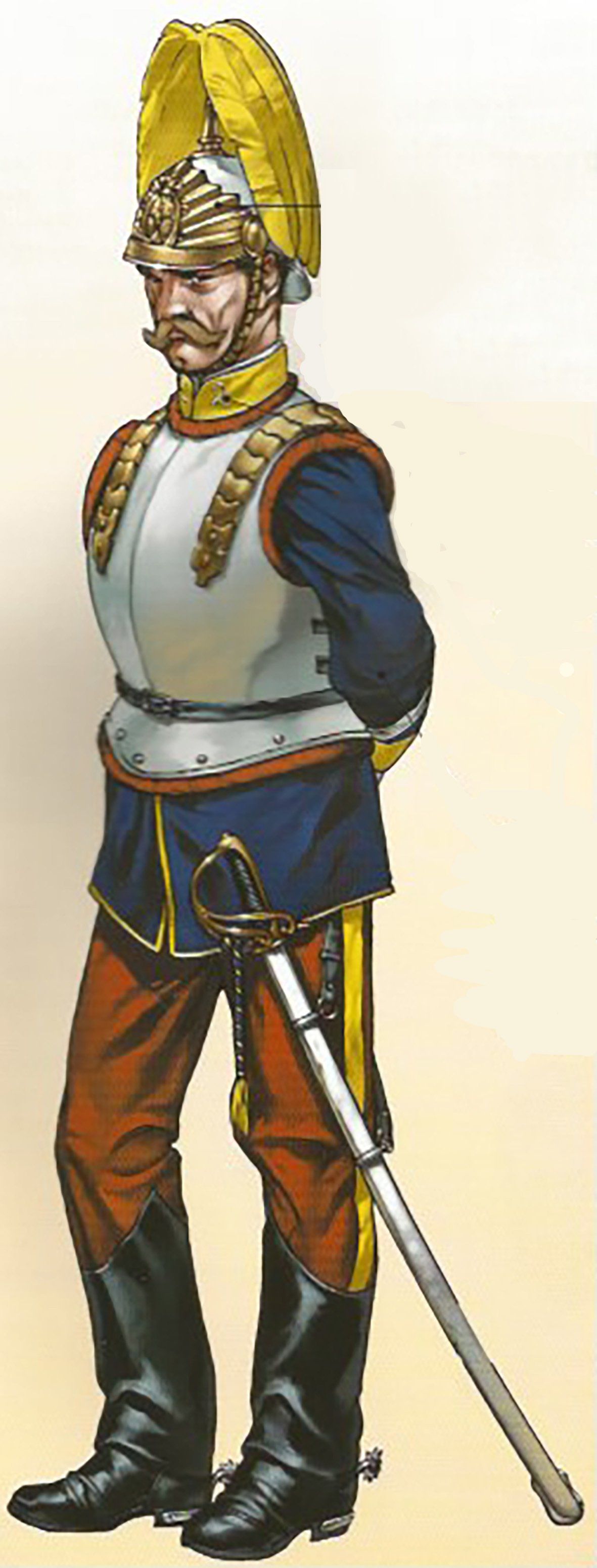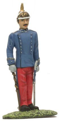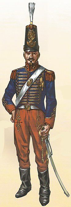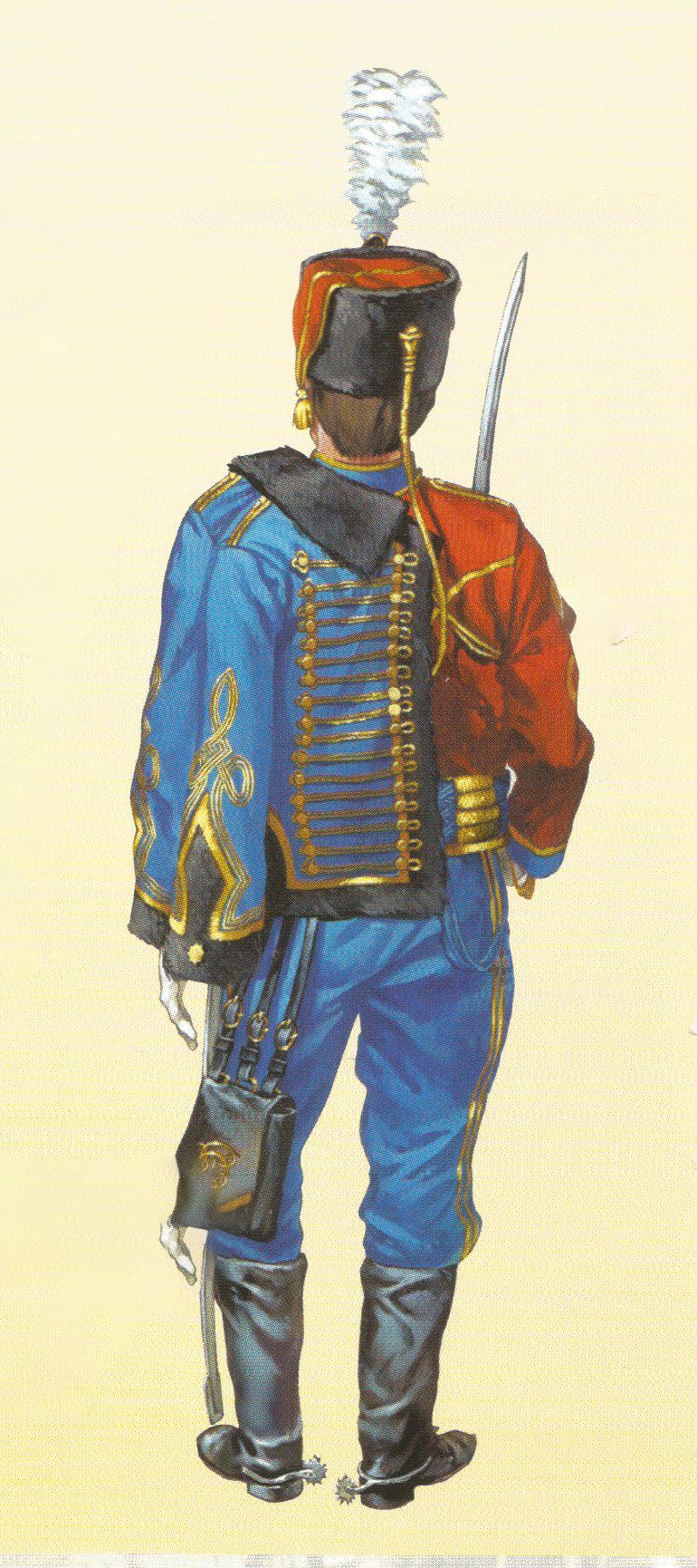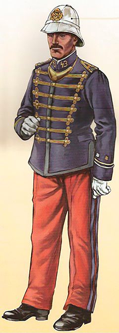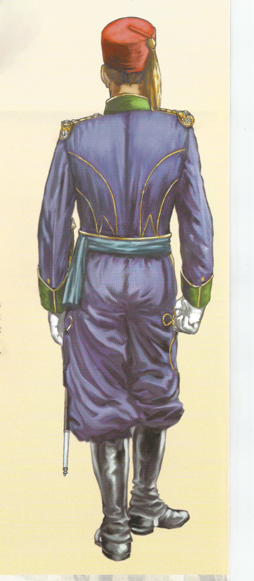 El pantalón que se utilizaba era ceñido y de punto blanco. Las polainas de gala estaban hechas con paño azul turquí y llevaban una docena de botones pequeños del cuerpo en el costado exterior y cuatro más de hueso negro en las trabillas. Completaba el uniforme el correaje amarillo, los borceguíes negros lisos con pala de una pieza y los guantes blancos.