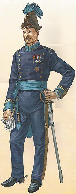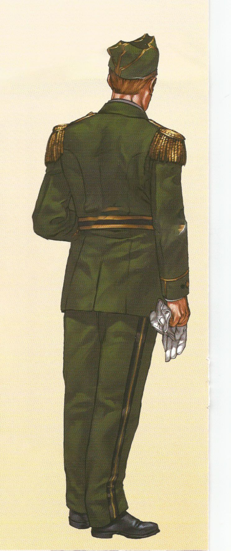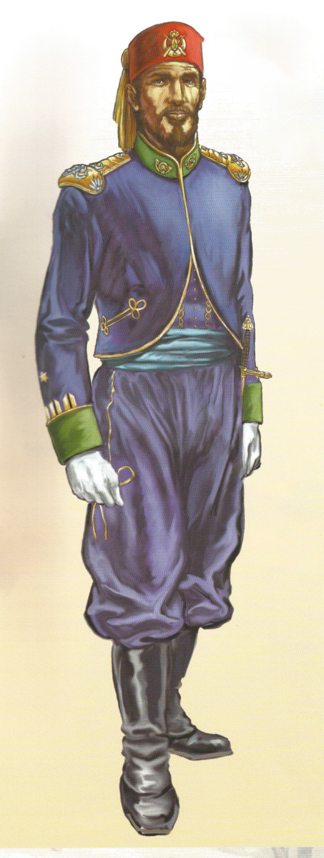 Con el uniforme de gala los oficiales usaban guantes blancos, gola en el cuello y en el sable un fiador dorado con perilla de hilos verdes y dora-dos. La chaqueta, el chaleco y el pantalón eran como los de diario, pero todos los adornos de sutás verde eran en este caso dorados. Además, la borla azul celeste del gorro se sustituía por otra también dorada.