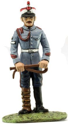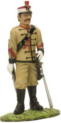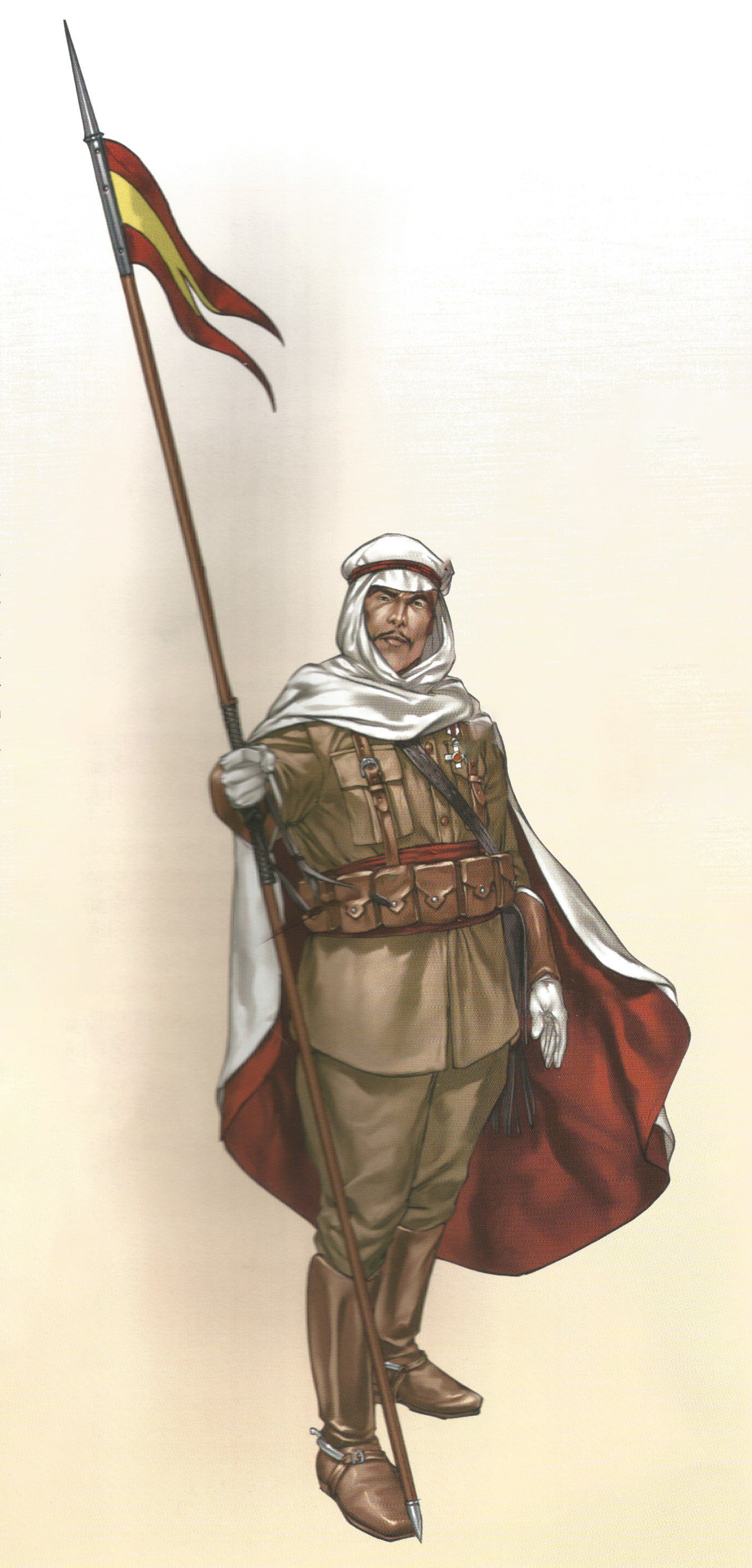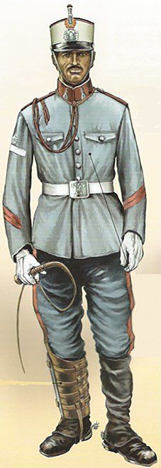 La figura de la ilustración viste uniforme para una formación en día de gala. La guerrera tiene el corte clásico, con cuello vuelto y en él el emblema de los Regulares de Caballería, que consiste en una media luna con el número 2 del grupo, dos lanzas cruzadas y la corona real encima, y una hilera de botones de cuero en el centro; en la manga izquierda el emblema de los batido-res, una pala en palo y un pico y una alabarda en aspa, y encima, otra vez, el emblema del grupo. Lleva manoplas de cuero, en cuyas esquinas se repite el emblema de batidor.