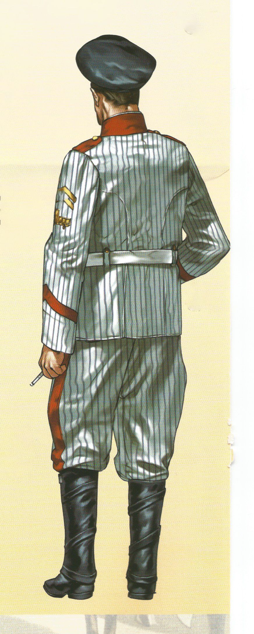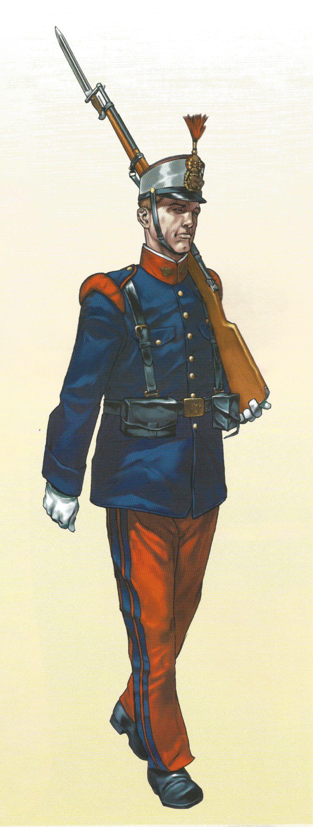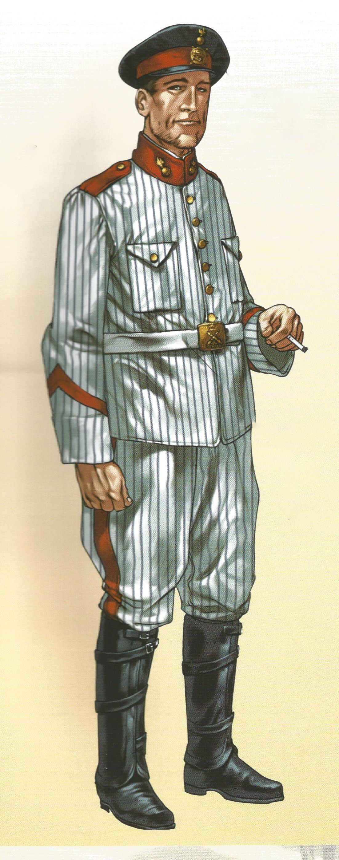 En 1911, año en el que se sitúa el soldado de la ilustración, se publicó un extenso reglamento en el que figuraba un uniforme para verano de tela rayadillo. La guerrera tenía cuello alto y hombreras de color rojo, bocamangas en pico rodeadas de una tira de paño igualmente rojo y en la manga izquierda, el distintivo de automovilismo.