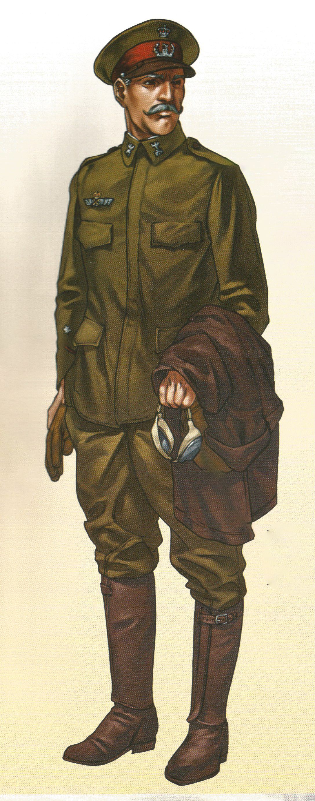 La ilustración del oficial piloto de estas páginas representa a un teniente del Cuerpo de Ingenieros, del cual procedía la mayor parte del personal del Servicio de Aeronáutica Militar, aunque también los había de otros Cuerpos y Armas (Infantería, Artillería, Caballería, Estado Mayor, etc.). El establecimiento de uniforme para el servicio de aeronáutica en este año de 1913 remite al que se usaba para las guarniciones de África según la descripción de 1906 y que era así: guerrera de tela caqui con amplio cuello vuelto con el emblema o el número del regimiento en los extremos; hombreras formadas por una tira de la misma tela, abrochada por el botón reglamentario que le correspondiese según su arma o cuerpo; estaba cerrada por una hilera de 5 botones de asta o pasta solapados bajo la tela; llevaba dos aberturas en los costados y cuatro bolsillos con carteras, dos en el pecho y dos en los faldones delanteros. La bocamanga estaba guarnecida por un cordón de seda de 2 milímetros de grueso y del color de los vivos del que correspondiesen. Por encima de dicho cordón los oficiales llevaban las divisas de su empleo mientras que los jefes las lucían bajo este.