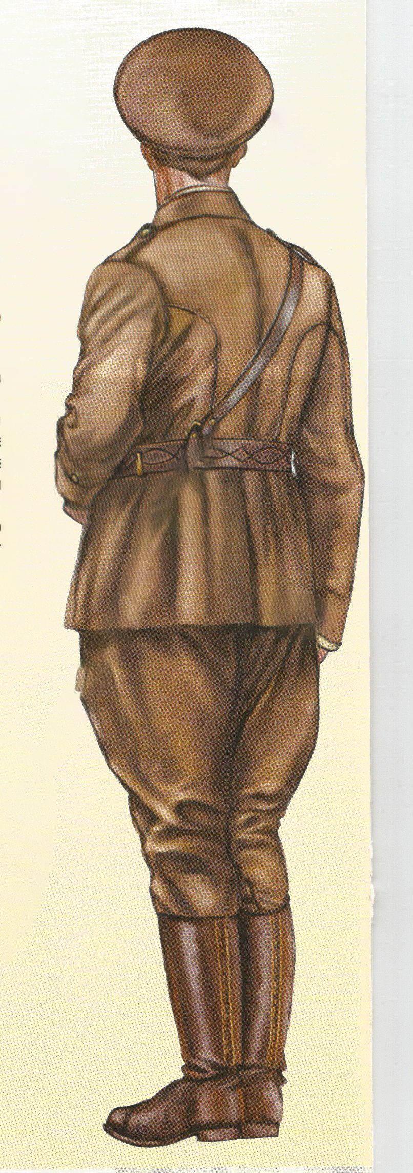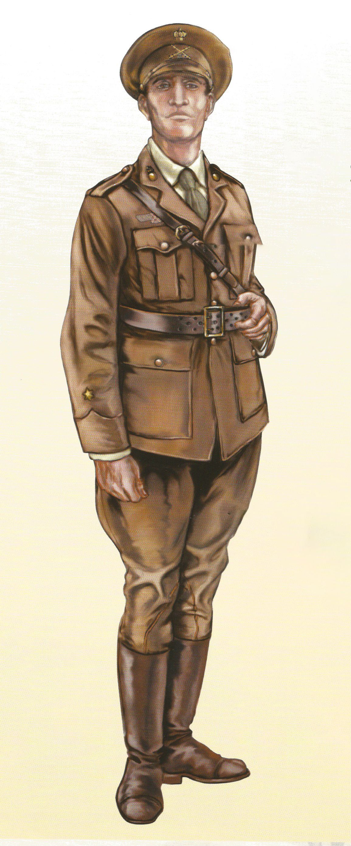 Así se buscó un color caqui verdoso diferente del caqui oscuro del ejército, si bien el corte de las guerreras y los pantalones tipo breeches era similar. La guerrera se diferenciaba por tener el cuello vuelto y bolsillos en la parte superior e inferior, sin tablilla. Los botones eran de pasta marrón oscuro. Las camisas eran del tipo usado por los deportistas de la época, en color verde claro, tenían amplios cuellos que se llevaban sobre el de la guerrera para protegerlo del roce diario.