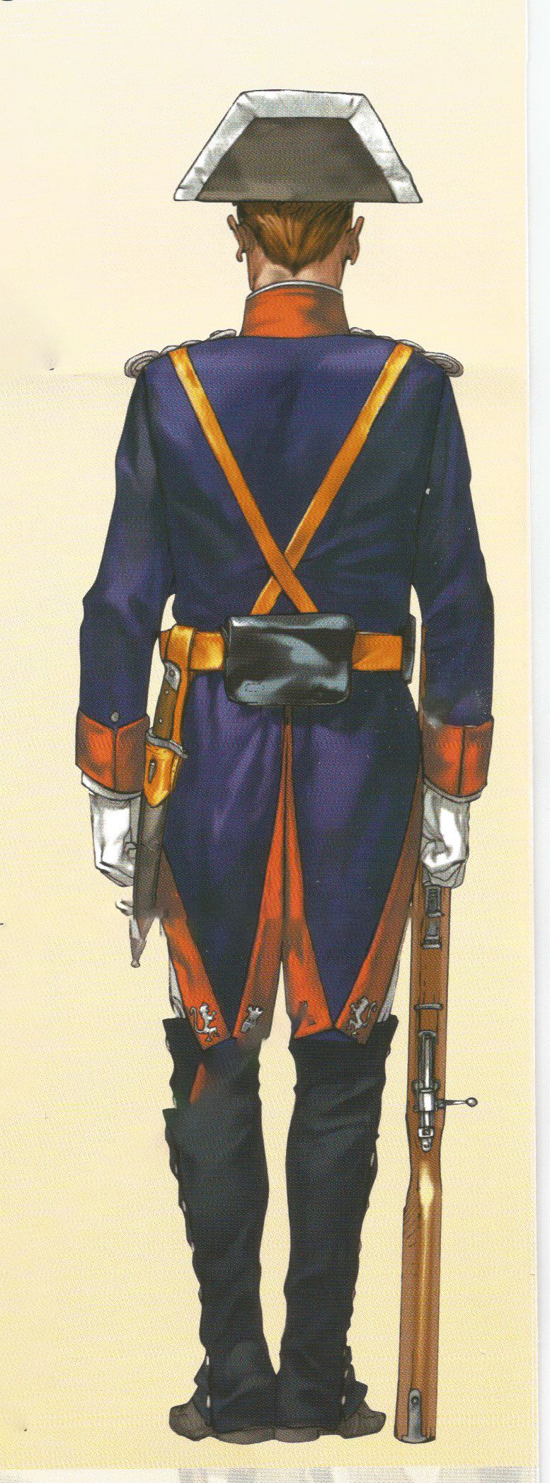 Los fusileros usaban viricú o ceñidor con una cartuchera ventral, mientras que los granaderos llevaban ademas, una bandolera de la que colgaba la clásica bolsa granadera. Del ceñidor colgaba también un espadín con vaina de cuero negro con herrajes en latón dorado.