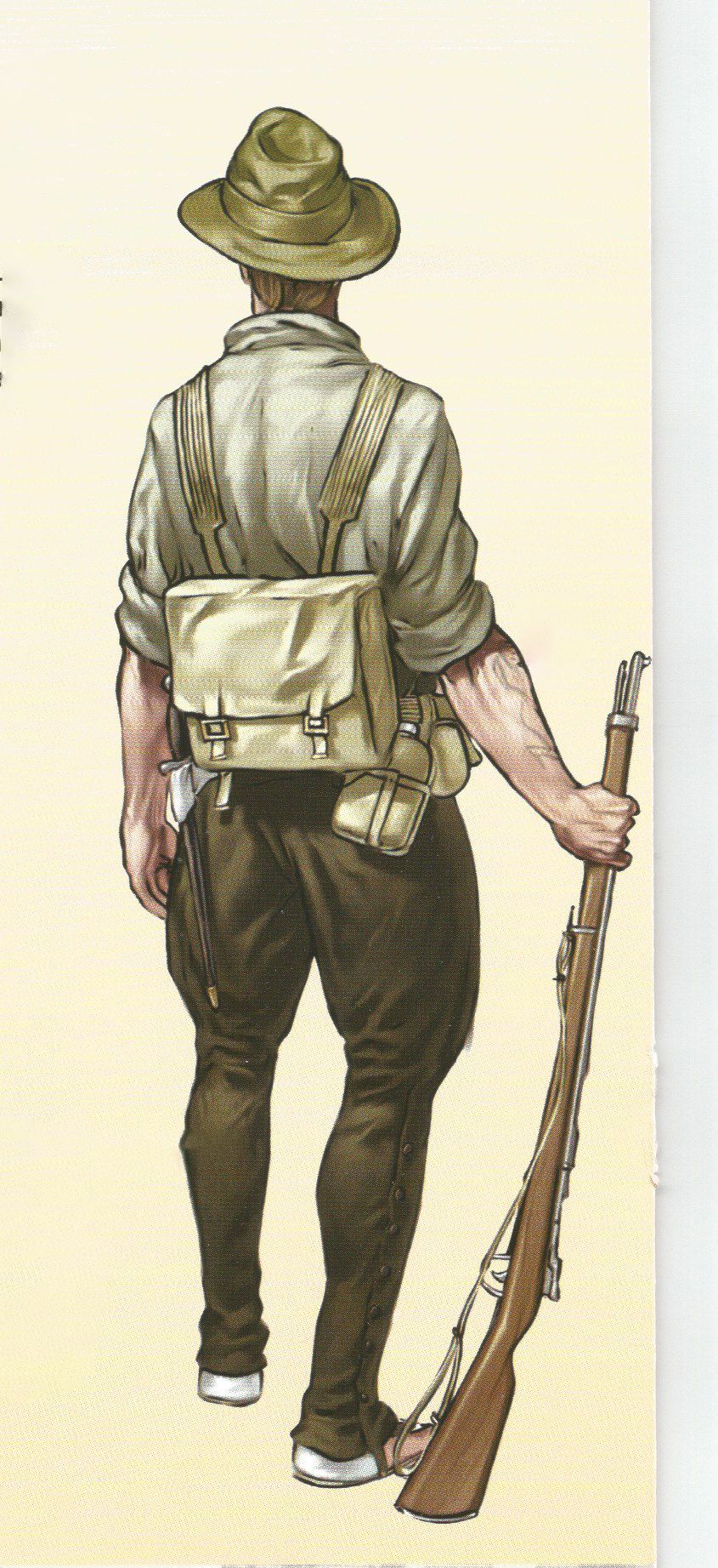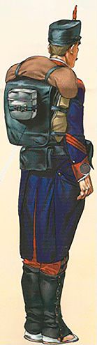 Tenía sólo la tapa de dos bolsillos en el pecho. El ros tenía funda negra en invierno y caqui en verano. Las polainas, también de color caqui tenían la misma forma que las de lona y eran más largas para los cuerpos montados. El calzado era el mismo reglamentario: alpargatas para campaña y zapatos para guarnición.