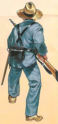 El cuello de la camisa se cerraba con una corbata o un pañuelo blanco. El pantalón recto de la misma tela, sin franja ni vivo, se llevaba con polainas de tela; también se llevaban calzones de montar con polainas de cuero.