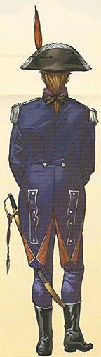 El uniforme que representamos en el Archivo General de Simancas, donde puede verse el dibujo del delantero izquierdo y de su espalda, en los que destacan los peculiares galoneados de frente, vuelta de las mangas, carteras y contracarteras. La casaca y el calzón son de paño azul, mientras que la chupa y las vueltas de la casaca dice que son de grana; en la Real Orden mencionada como “encarnadas”, coloradas, rojas, mientras que aquí, al concretarla en “grana”, se refiere al modelo del tinte, que sobre la base de las agallas que forman las hembras de la cochinilla que vive en las coscojas, arboles parecidos a las encinas, y que dan esta peculiar tonalidad.