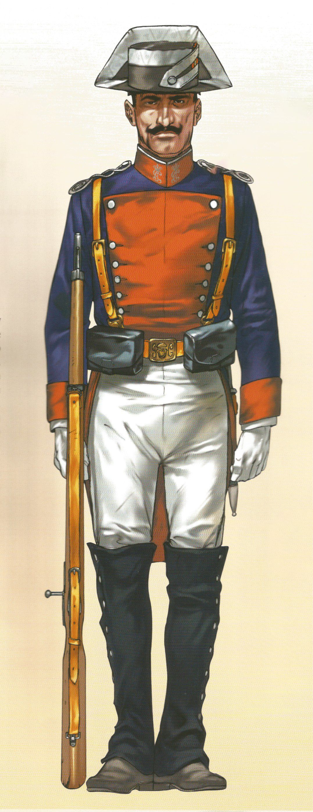 Los fusileros usaban viricú o ceñidor con una cartuchera ventral, mientras que los granaderos llevaban ademas, una bandolera de la que colgaba la clásica bolsa granadera. Del ceñidor colgaba también un espadín con vaina de cuero negro con herrajes en latón dorado.