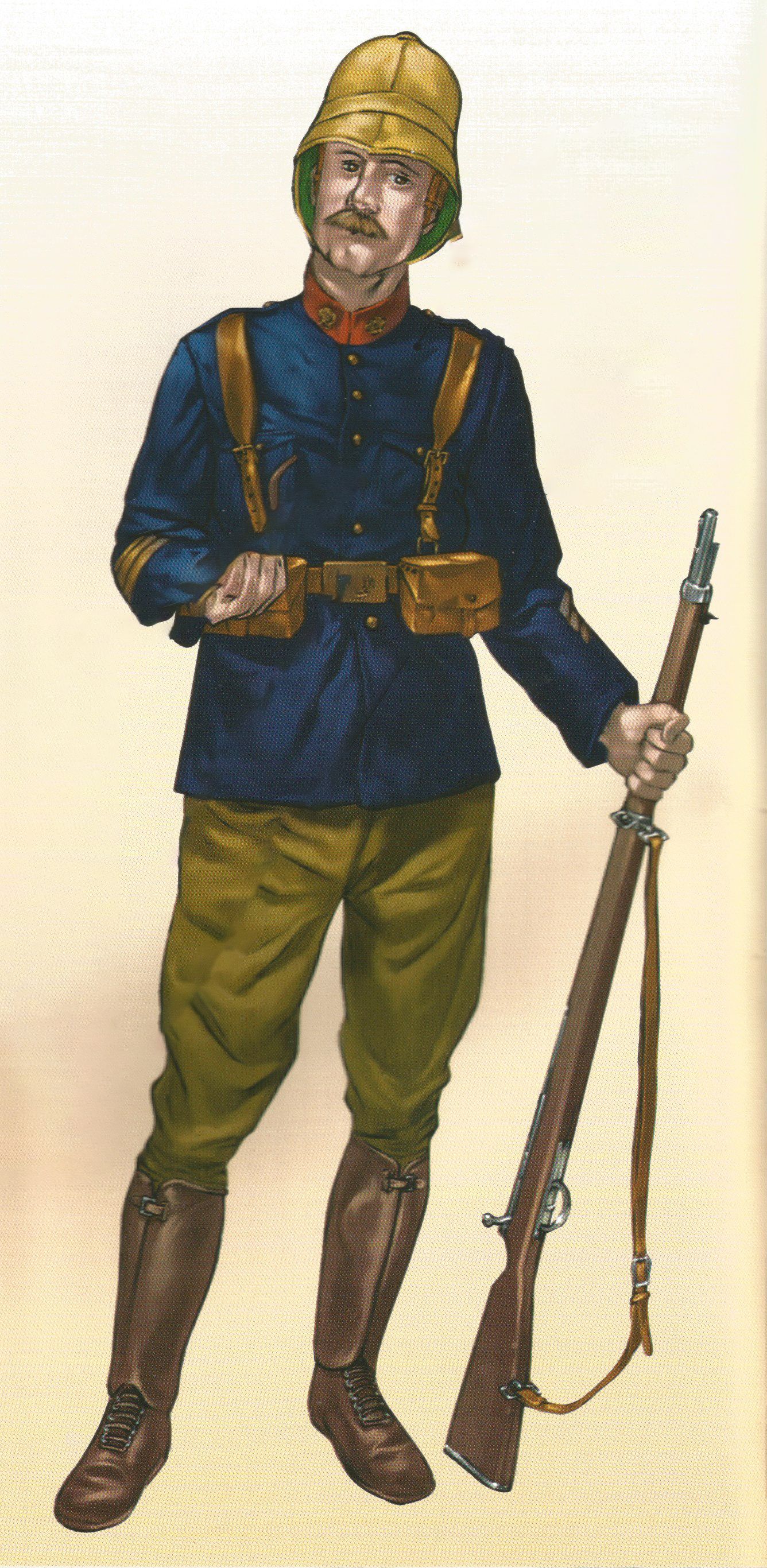 El uniforme del soldado de la ilustración es una combinación no totalmente reglamentaria de otros dos uniformes y de una variante para Marruecos: la guerrera de paño azul turquí que se reglamentó en 1909 para la tropa de la mayor parte de las armas y cuerpos, los cuales se distinguían por el color de los cuellos y los emblemas que iban sobre ellos. Los pantalones y las polainas son de rayadillo y corresponden al uniforme de verano de 1901. En ingenieros, el cuello de la guerrera era grana y el emblema consistía en un castillo de plata.